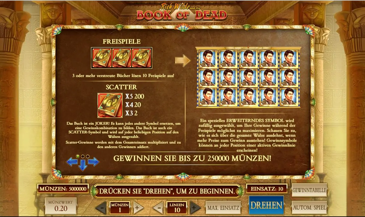 Ein Forscher, Mumien und Symbole sind hier bei Book of Dead die Hauptdarsteller. Die Buchstaben A, K, Q, J oder die Zahl 10 sind auch nicht zu verachten, bringen aber wesentlich weniger Gewinne bei diesem Slot. Wer auf hohe Gewinnausschüttungen steht, sollte mit hohen Einsätzen spielen und sein Augenmerk auf die Bilder und Zeichen legen, denn diese gewinnen richtig viel. Die Grafik ist eine der Besten bei Spielautomaten. Sogar auf dem Smartphone, Handy oder Tablet sieht das Spiel einfach genial aus und man bekommt nicht direkt Tränen in die Augen wie bei vielen anderen Slots.