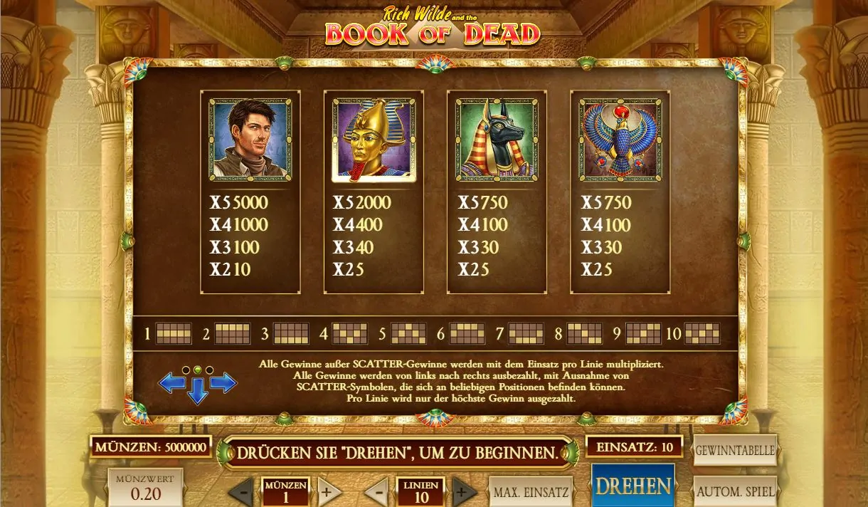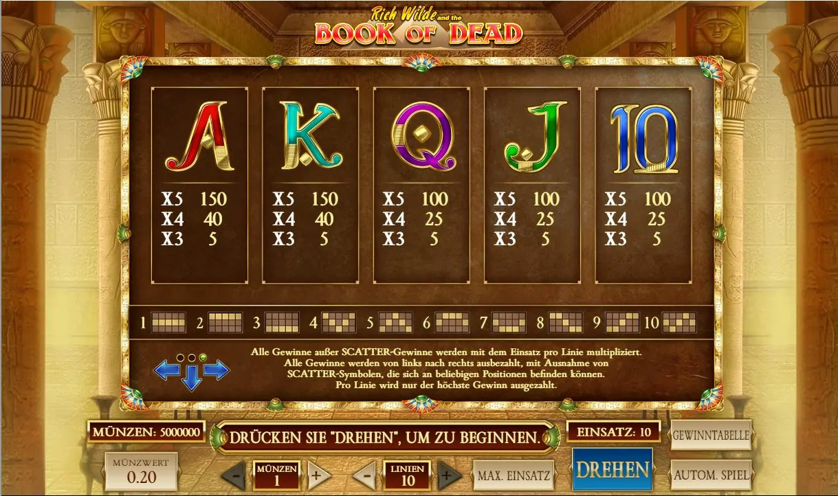 Wie bei jedem Spielautomat, gibt es auch bei Book of Dead eine Gewinntabelle. In dieser sieht man welche Buchstaben, Symbole oder Bilder welchen Gewinne erzielen. x3, x4 und x5 bedeuten die Anzahl der gleichen Symbole in einer Reiher der Gewinnlinie. Hier haben wir die Übersicht in eine Tabelle gepackt:
