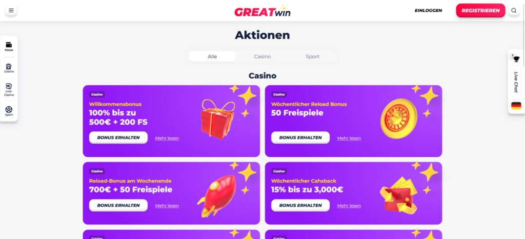 Weiter zum Aufbau der Casino-Webseite: Linker Hand ganz oben ist eine ausklappbare Navigation angelegt. Über diese gelangt man zu allen für die Spieler relevanten Casinokategorien. Zunächst die wichtigste: Der Casinobereich mit Slots, Tischspielen und Jackpots – man kann sich bei GreatWin auch nur die neuesten oder beliebtesten Spiele anzeigen lassen. Weiter gehts mit dem Live Casino – dort sind die wichtigsten Spielarten wie Roulette, Poker, Baccarat und auch spannende Live-Shows einzeln auflistbar.