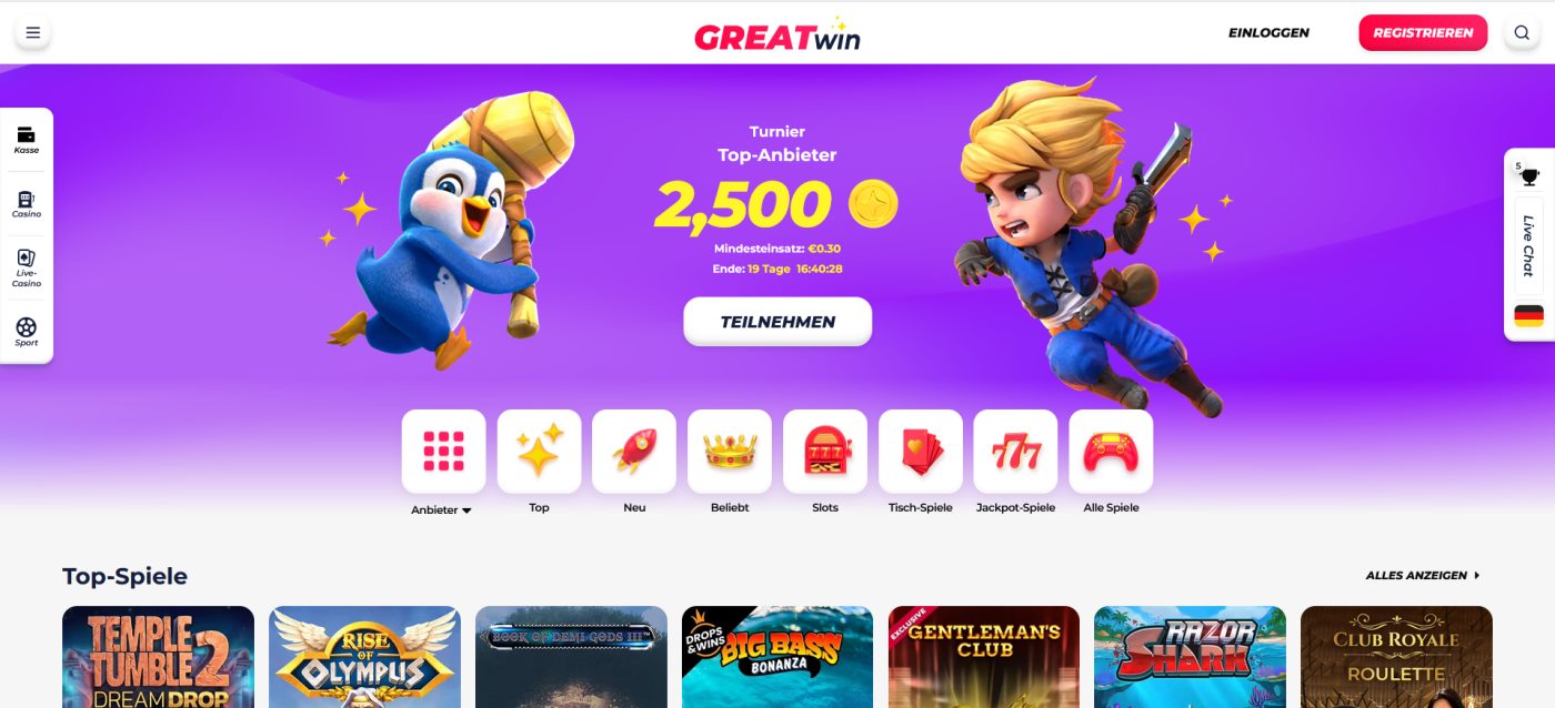 Great -Win erweitert das Spieleangebot kontinuierlich um die neuesten Titel, weshalb das Spielangebot permanent weiter am wachsen ist. Auch neuere Spieleschmieden, die noch nicht allzu bekannt sind, erhalten hier eine Chance. Perfekt, dass bei GreatWin alle Spielautomaten ohne Setzlimit, ohne 5-Sekunden-Pause, aber dafür mit Turbospin und Autospin laufen. Natürlich sind alle Spielautomaten geprüft und mit RNG ausgestattet. Ein wahres Eldorado für Slotliebhaber!