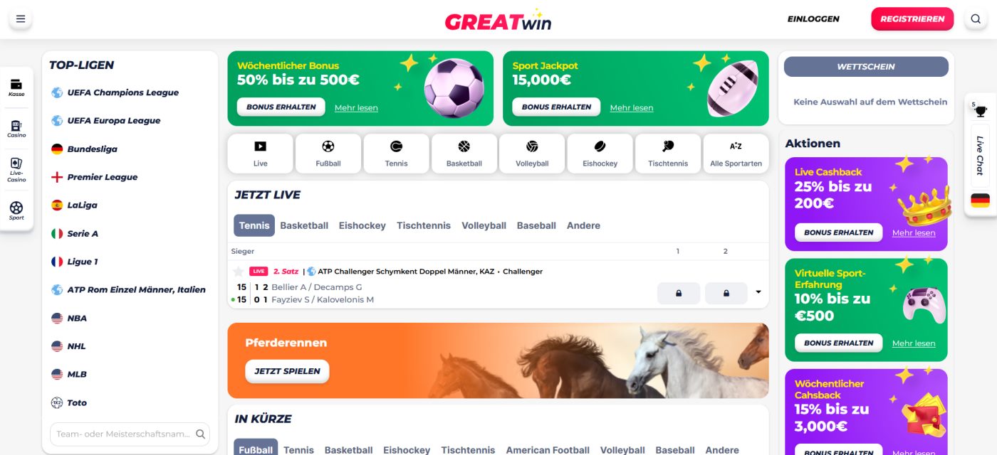Als Nächstes ist der Sportbereich in der Navigation untergebracht, mit Sportwetten, Live-Wetten, Pferderennen und eSports-Wetten. Besondere Aktionen, Turniere, wöchentliche Herausforderungen, der VIP-Bereich und der Shop sind auch in der Menüleiste anwählbar. Eine spezielle Give-Away Seite war zum Zeitpunkt unserer GreatWin Test noch im Aufbau und dürfte eine kleine Überraschung werden.