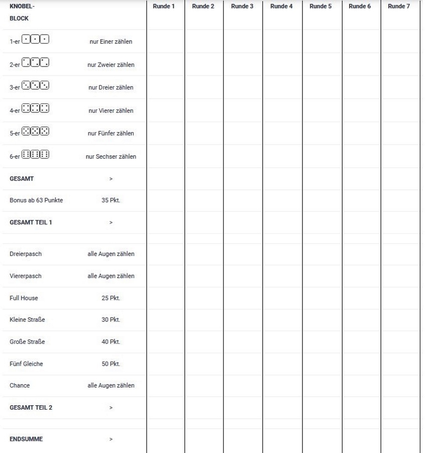 Bei dem klassischen Würfelspiel Knobeln sind auf dem Knobel-Spielblock die Figuren, die man würfeln muss, bereits vorgegeben. Die Vorgaben unterscheiden sich wirklich nur geringfügig von denen auf einem Kniffelblock oder Yahtzee-Block. Ein Knobelblatt kann man sich auch nach der Vorlage oben selbst anfertigen, auf dem PC abspeichern und bei Bedarf ausdrucken. Hier könnt ihr online Knobeln oder kostenlose Knobelblätter downloaden.