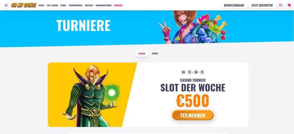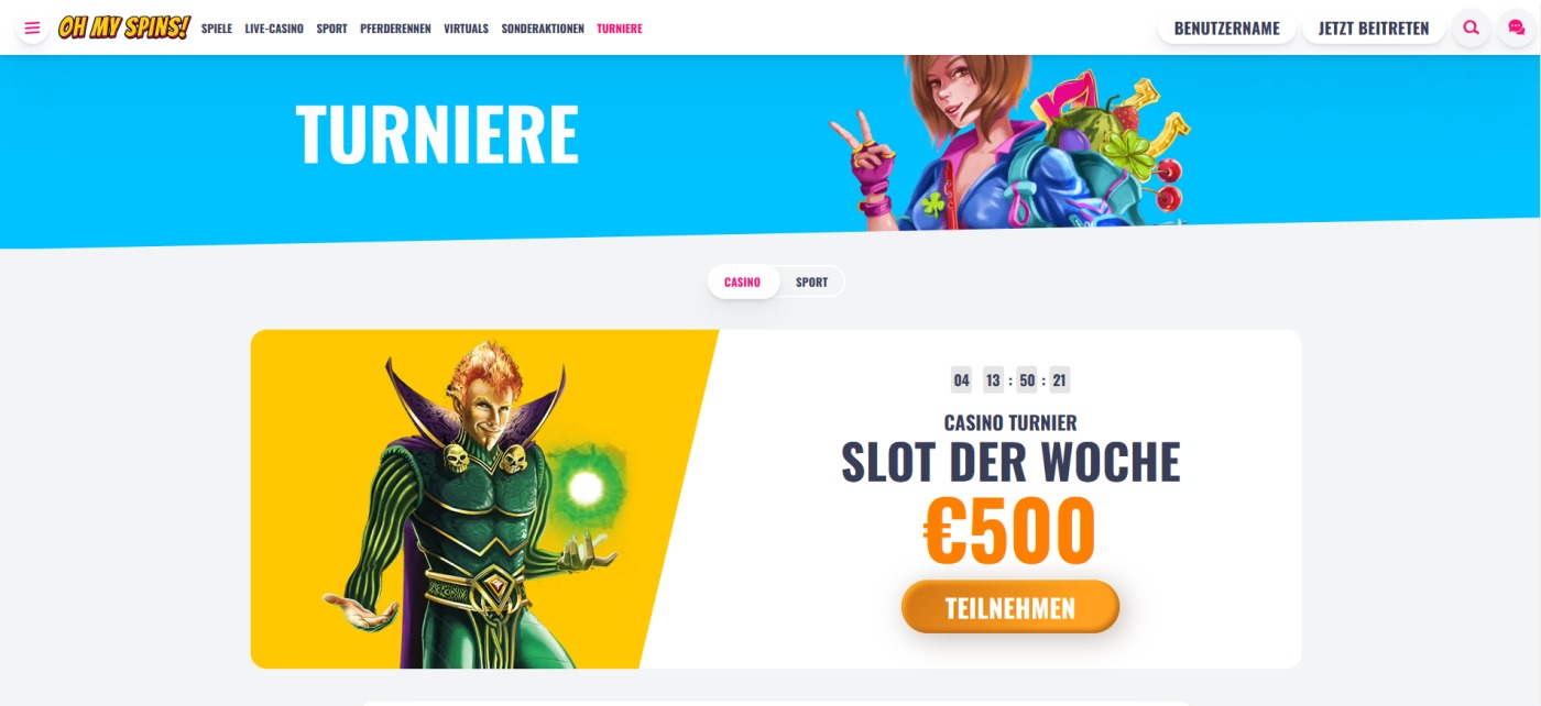 Aufregende Turniere gehören bei OhMySpins definitiv zum Tagesgeschäft. Sowohl der Casino Bereich als auch der Sport Bereich halten für Spieler täglich spannende Casino Turniere bereit. Geht auf die Jagd nach den riesigen Preispools, die nicht selten im vier- oder gar sechsstelligen Bereich liegen. Wer Lust auf ein Sport-Turnier hat, erhält mit jeder einzelnen abgegebenen Wette auf Top-Sportligen Punkte, die euch auf der Turnierleiter ein Treppchen höher steigen lassen. Schafft ihr es, eine Platzierung unter den Top 30 zu belegen, winkt ein tolles Preisgeld.