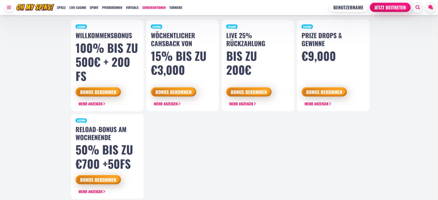 Nicht nur Neukunden dürfen sich über einen Bonus freuen, denn auch für Bestandskunden hält OhMySpins immer wieder tolle Bonusangebote bereit. Wer sich neu registriert, kann sich den Willkommensbonus mit einem Bonusguthaben von bis zu 500€ inklusive 200 Freispielen sichern. Mit einer Mindesteinzahlung von nur 20€ holt ihr euch 100% Extraguthaben und Freespins auf euer Spielerkonto. Die Gratisspiele sind 10 Tage in Folge zu jeweils 20 Stück verfügbar und ihr müsst sie lediglich in eurem Konto aktivieren. Die ersten Freispiele können direkt nach eurer qualifizierten Ersteinzahlung für 24 Stunden in Anspruch genommen werden, weitere werden nach wiederum 24 Stunden im Konto verfügbar.