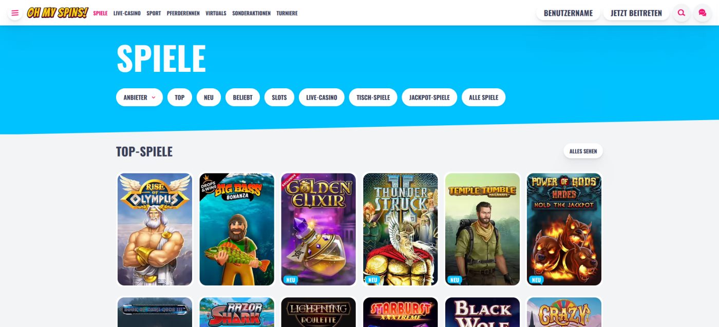 Das Portfolio bei OhMySpins Casino Online ist riesig und bietet alles, was das Spielerherz höher schlagen lässt. Neben den üblichen Slotautomaten sind auch zahlreiche Tischspiele wie Roulette, Poker, BlackJack und Baccarat vertreten. Weiterhin muss man als Spieler nicht auf proppenvolle Jackpot Spiele verzichten und im Live Casino warten bereits die freundlichen Live Dealer darauf, dass ihr an einem ihrer virtuellen Spieltische Platz nehmt. Neben den üblichen Live-Games könnt ihr in der Rubrik auch Spiele wie Dreamcatcher, Deal or No Deal und das beliebte Wheel of Fortune finden.