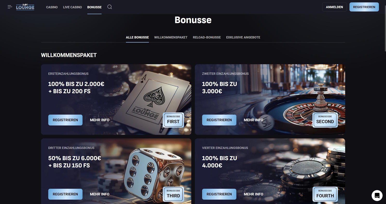 Bis zu 15.000 € auf die ersten 4 Einzahlungen + 350 FSSlotlounge Casino - Jetzt 350 Free Spins & mega 4-fach Bonus
